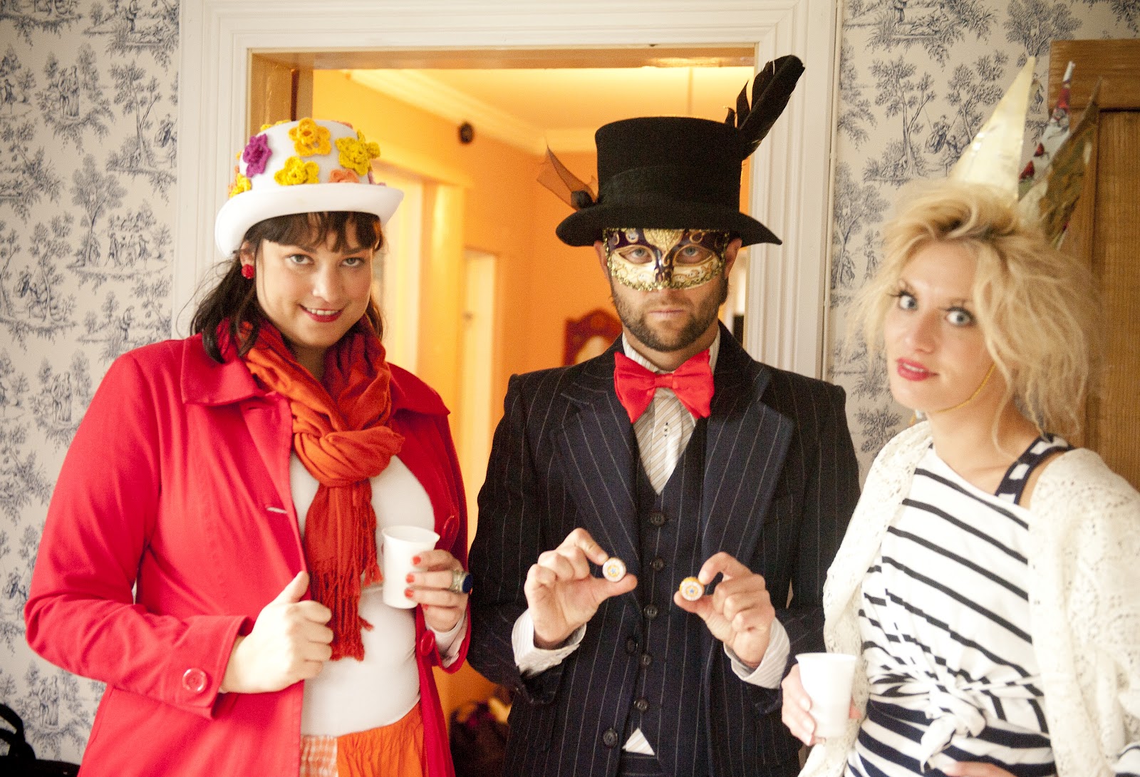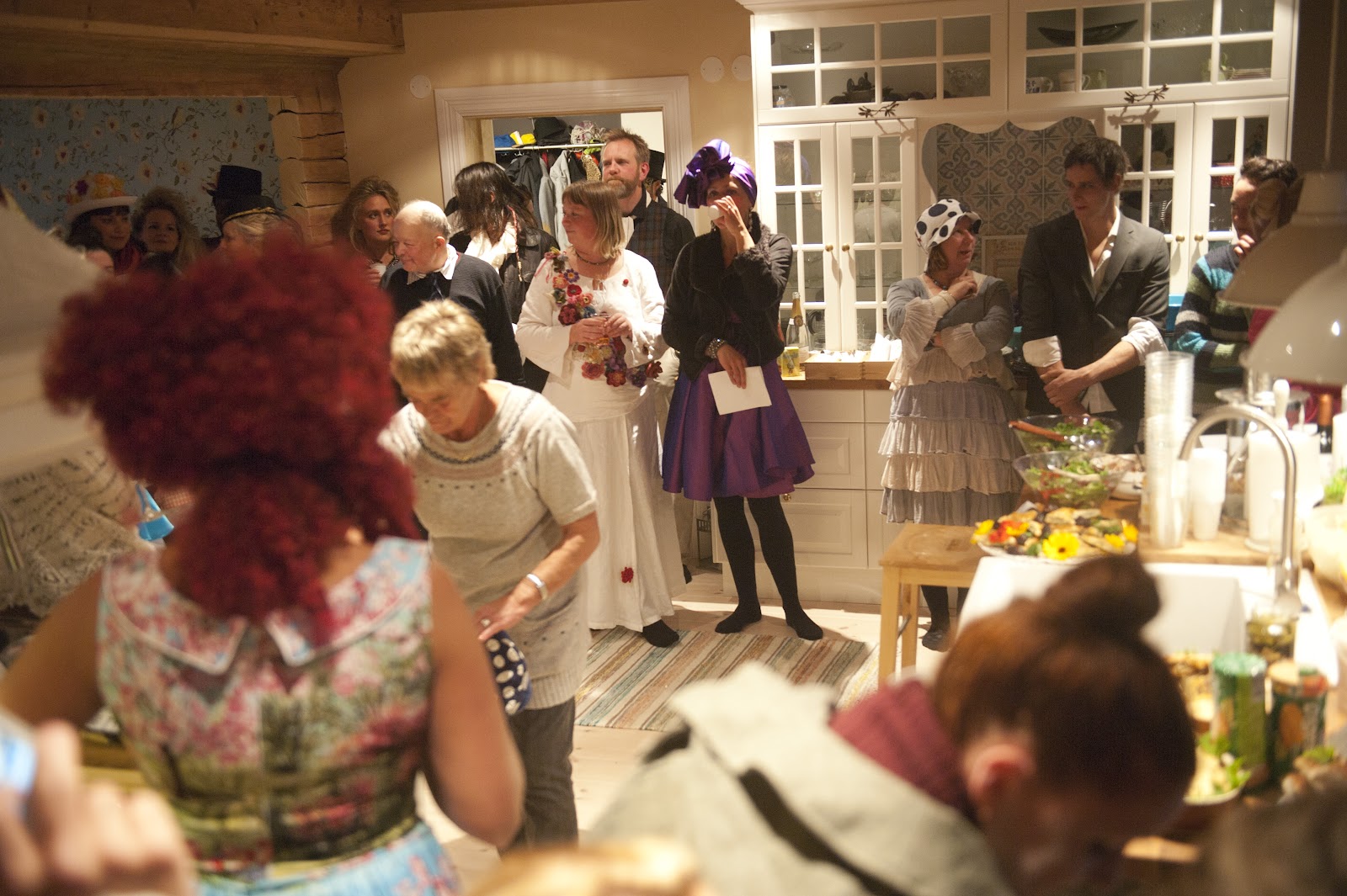 Hela köket och huset var fyllt av vackra klänningar och peruker och mad-hatter hattar.