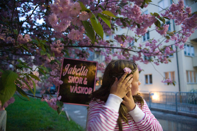När mitt gudbarn Melvin döptes i Stockholm förra helgen så hade hans mamma, min kusin, hyst in oss på ett litet hotell som hade ljuvlig körsbärsblom utanför. Och min guddotter Alva är precis som mig, hon ser varje chans att få klä sitt tjocka vackra hår med blomster.Vi tittade på körsbärsblomoch åt en fantastisk middag på La Famiglia på KungsholmenSedan var det dags för Melvins dop.Söta fina Melvin.Kusinen från stan. Han som är på pricken 6 månader yngre än Viggo.