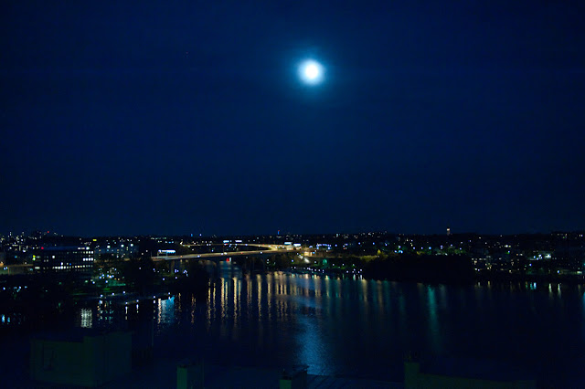 Oj vad jag har rest till vår huvudstad den här hösten. Och bott på hotell. Centrala hotell. Jag har bott på Grand Central, Rica (i Pubhuset) och Clarion Sign. Och den här veckan inleddes med den sistnämnda. Deras foajé är full av vackra klassiker av Arne Jacobsen.Det är roligt i Stockholm. Mycket design, form, trendiga människor, tjusiga varelser i höga klackar. Bilar, vägar, övergångsställen, butiker…en ändlös energi av strömmande folkmassor.och silutten är vacker. Speciellt när man bor högst upp på tionde våningen som vi gjorde.och det finns parker och träd och vattenMen ändå liknar det inte Värmland. Hjärtat smälter på mig ju närmare jag kommer den värmländska himlen. Denna enormt hemkära tendens är alldeles ny för mig. Jag känner inte igen den. Jag brukar vara tvärtom. Hylla det som är ”borta”. Men nu är det som om jag inte kan få nog av vidder, natur, luft, utrymme, tiomilaskogar…är det åldern tro? Jag fyller snart 35. Vill bara gå i skogen. Springa, åka skidor, elda. Vara ett med moder jord. Oj, oj. Och som ni ser på bilden är det friluftsmänniskan i mig som regerar nu. När jag tillochmed tar Jöggas dunsportjacka på mig till självaste huvudstaden. -