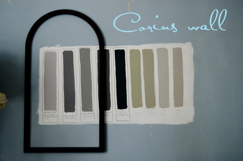 Så skulle hon måla sitt vardagsrum men var inte helt säker på färgen, så då hade hon målat två testväggar för att hitta rätt. Men jag tyckte det var grymt vackert, nästan som poesi. Det är visst så här man ska göra när man ska hitta rätt för att se hur färgen artar sig i lika ljus.