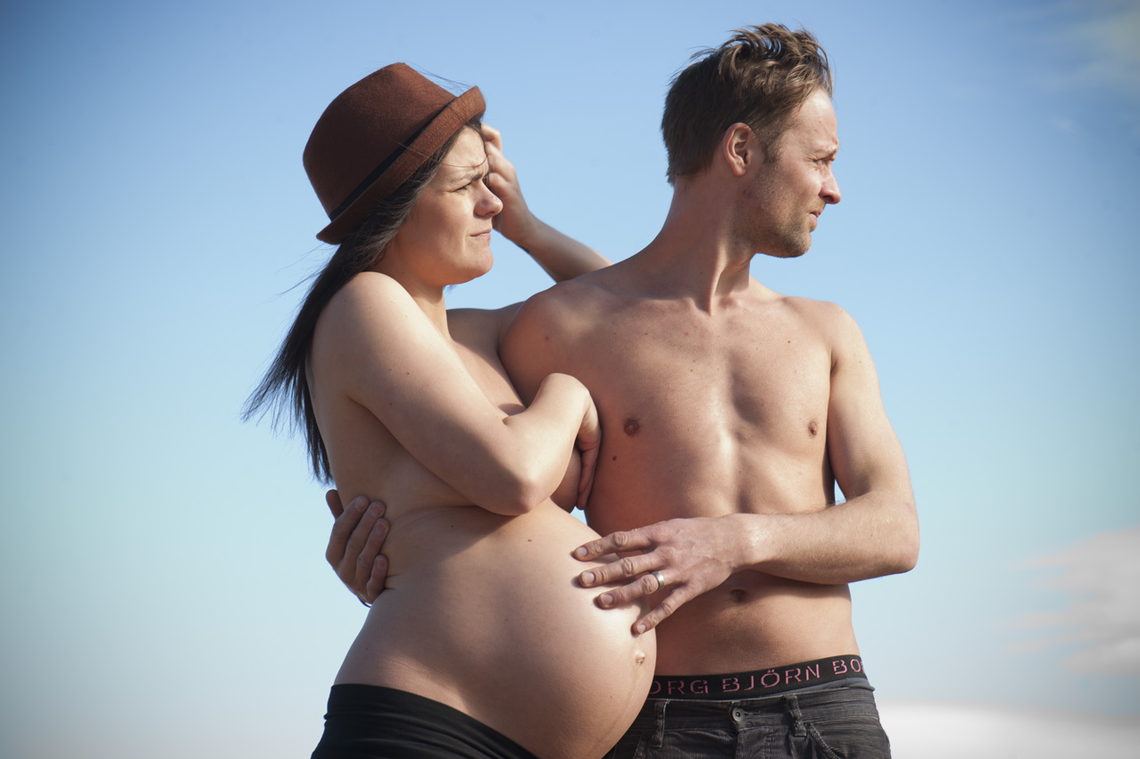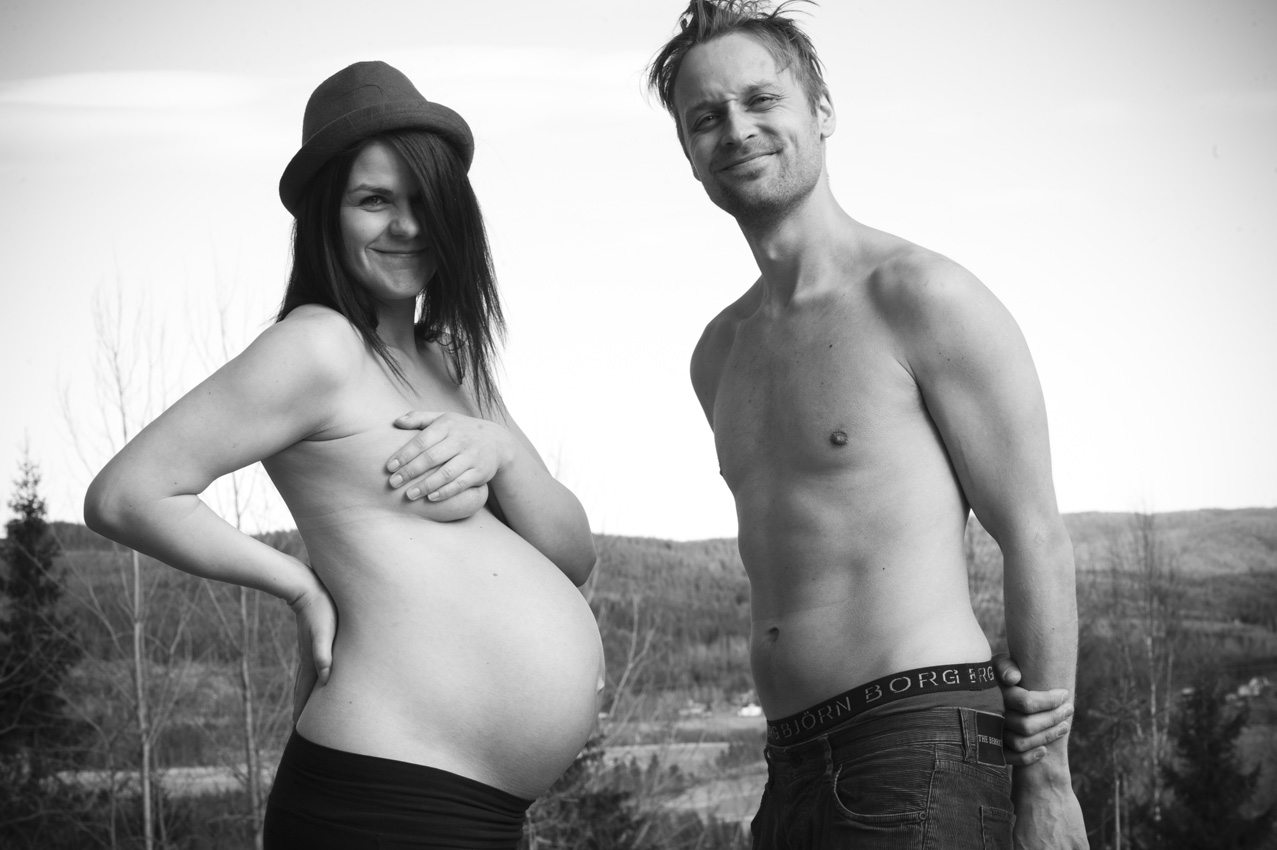 Som när Lena och Anders (vars bröllop jag fotograferade i somras) kom för att kika på vårt renoveringsprojekt i söndags när jag höll på att fixa som mest. Och Lena som ska ha barn om två veckor och är sådär supervackert gravid så fåglarna kvittrar när man ser henne ville gärna ha sin mage fotograferad av mig och jag sa: ja, vi går ut och tittar. Jag har kameran i bilen.